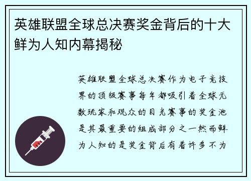 英雄联盟全球总决赛,作为电子竞技界的顶级赛事,每年都吸引着全球无数玩家和观众的目光。赛事的奖金池是其最重要的组成部分之一,然而,鲜为人知的是,奖金背后有着许多不为人知的内幕。本文将从多个角度揭示英雄联...